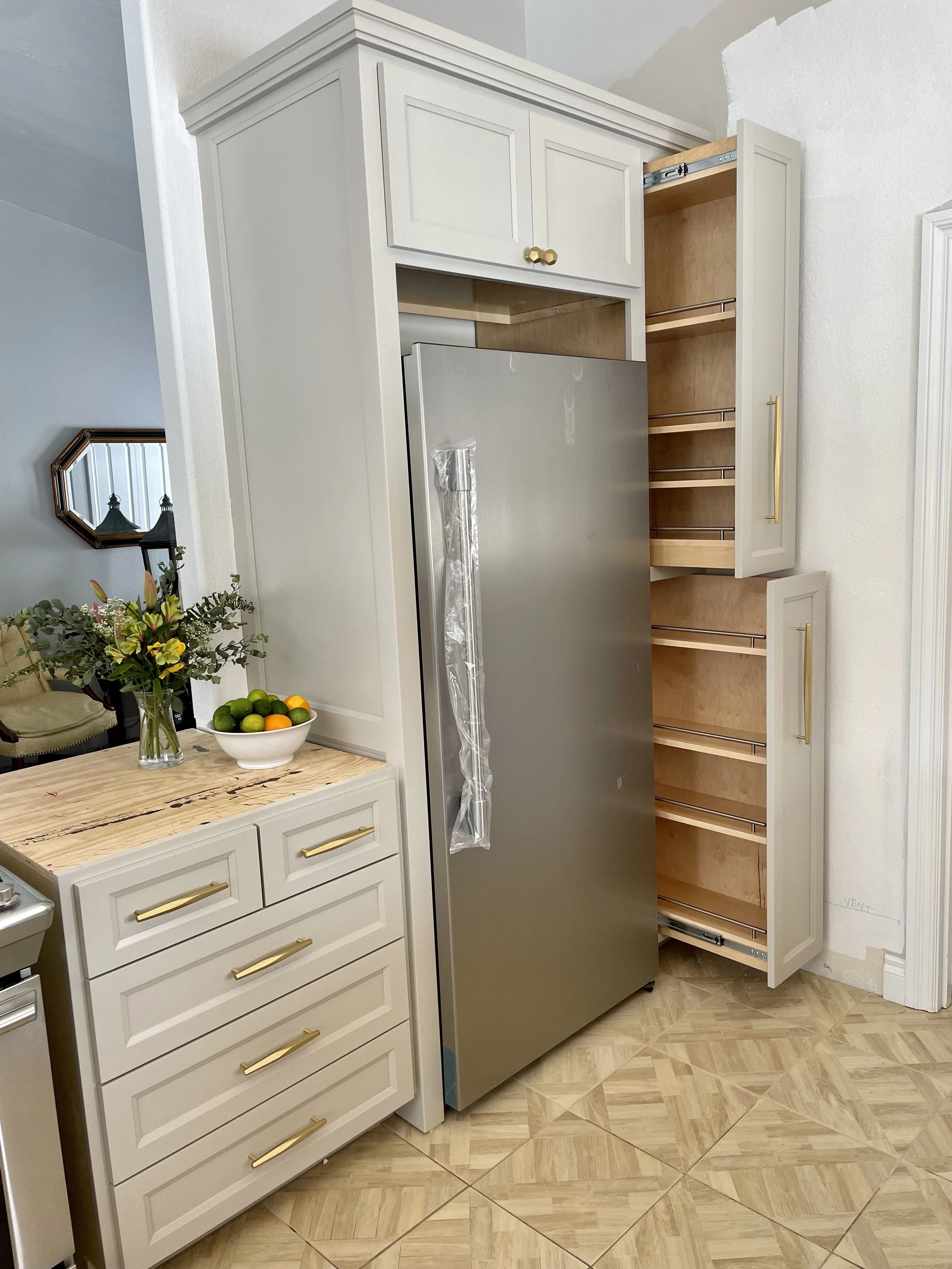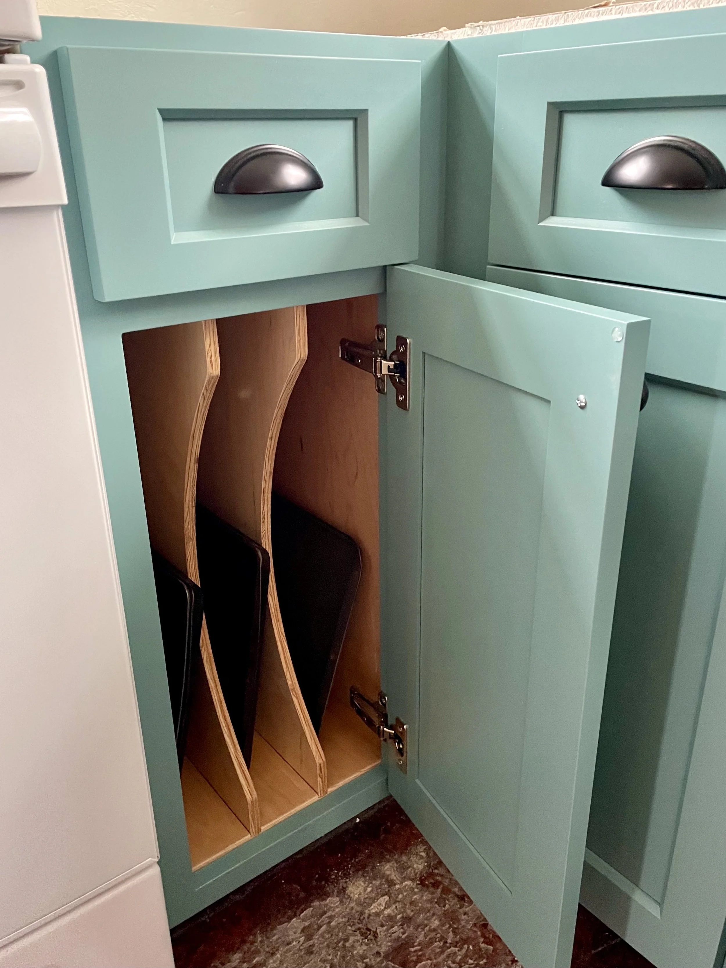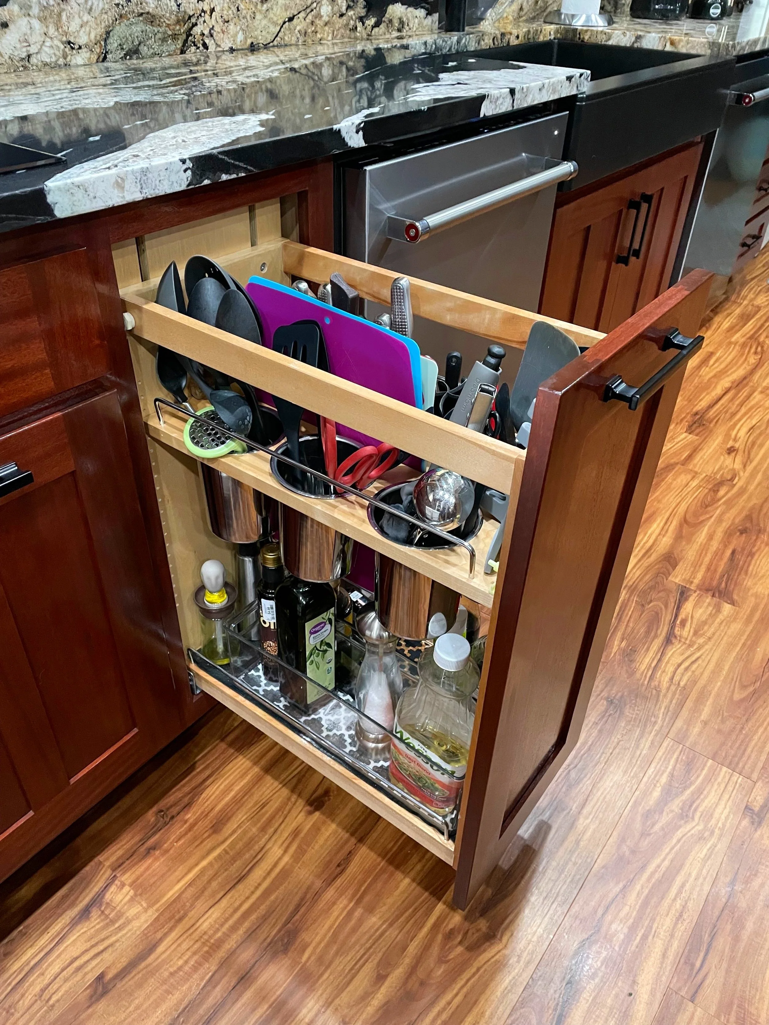 Storage options are also seemingly limitless. These include items such as garbage pullouts, pot and pan hangers, dividers in drawers, cookie sheet dividers, spice racks and more. The pictures below showcase a few of my favorite options.